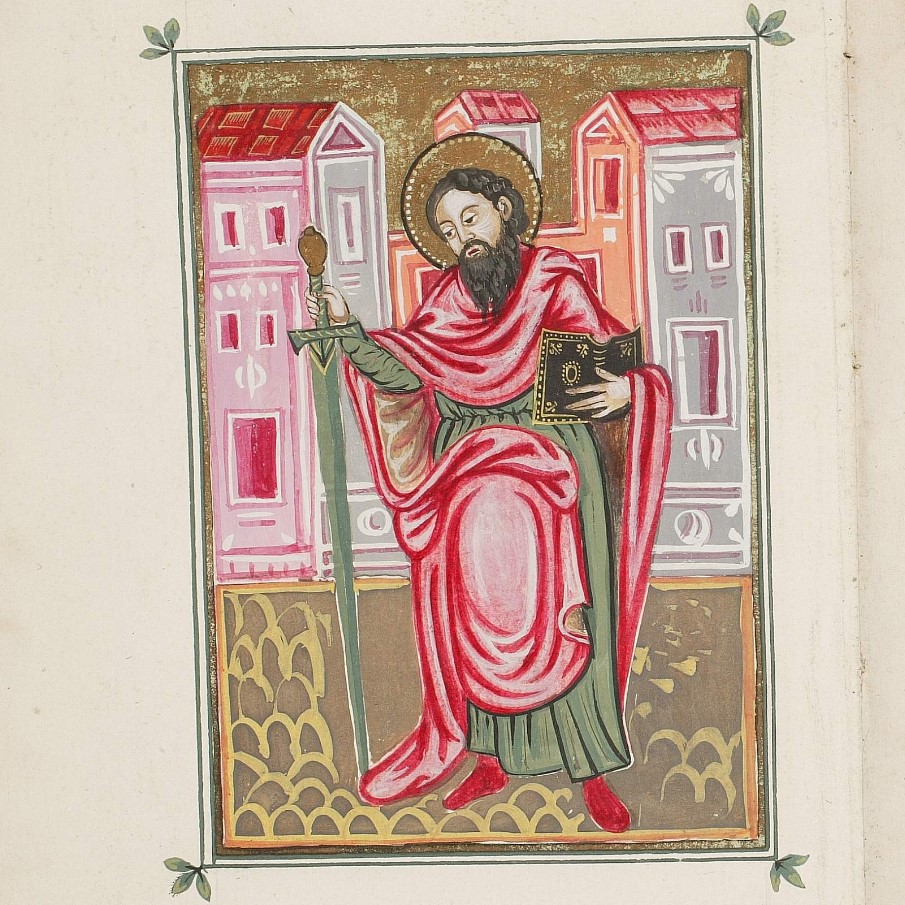 The collection includes all manner of texts, but the most common are liturgical works, such as copies of the Menaion, the Euchologion, Octoechos, Psalters, and Gospel books. Distinctive hagiographical works includes the lives of Serbian saints Sava (1169-1237) and Simeon (or Stefan Nemanja, 1114-1200). There are also numerous volumes of church law or the Nomocanon. The works written in Cyrillic date from the 13th to the 19th centuries, while the Glagolitic books tend to be older, dating from the 10th to the 16th centuries.One highlight is a 1610 manuscript copied at the Dragomirna Monastery, in Moldavia, probably by or thanks to the support of Anastasie Crimca. The book is a Praxapostolos (Biblical manuscript containing the Acts of the Apostles and Epistles), and it is heavily illustrated with images that can be found in HMML's color microfilm collection (Codex Vindobonensis Palatinus. Slav. 6, HMML project 24142). https://www.vhmml.org/readingRoom/view/49737