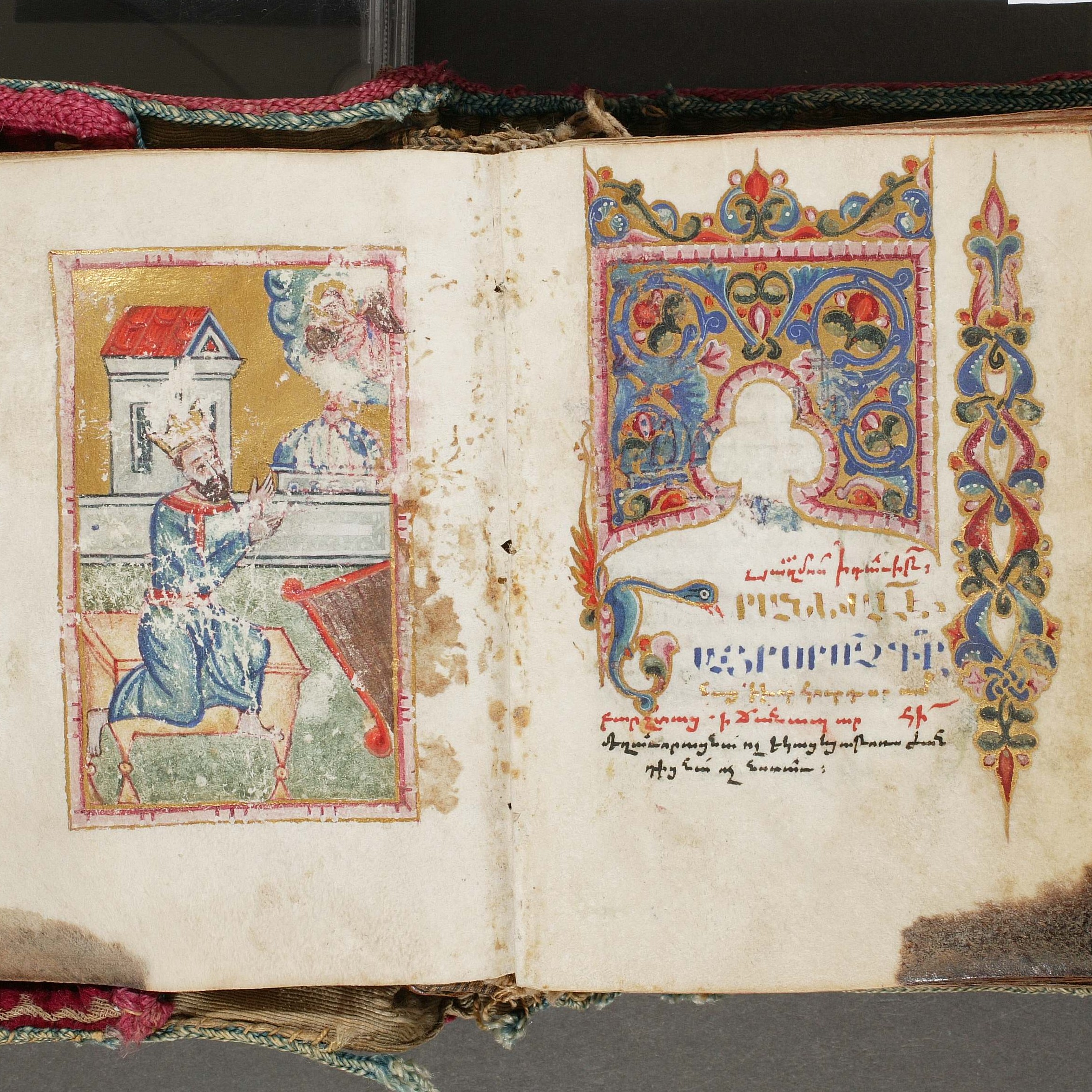 The Bzummār repository includes an exceptionally rich collection of illuminated and illustrated manuscripts, with works dating as far back as the early 12th century. Among the earliest is a 12th-century copy of Mosēs Khorenatsʻi’s Ashkharhatsʻoytsʻ, or Geography (BzBz 00204); a 13th-century copy of Mkhitʻar Gōsh’s Datastanagirkʻ Hayotsʻ, or Armenian Code of Laws (BzBz 00180); and a 1289 copy of the important Commentary on the Psalms by Daniel of Ṣalaḥ, translated by Grigor Vkayasēr (BzBz 00120).